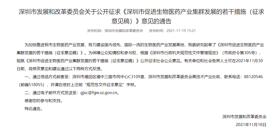 近日,為落實(shí)《中共中央 國(guó)務(wù)院關(guān)于支持深圳建設(shè)中國(guó)特色社會(huì)主義先行示范區(qū)的意見》《深圳市關(guān)于進(jìn)一步加快發(fā)展戰(zhàn)略性新興產(chǎn)業(yè)的實(shí)施方案》(深府〔2018〕84號(hào))等政策精神,充分銜接《深圳市促進(jìn)生物醫(yī)藥產(chǎn)業(yè)集聚發(fā)展指導(dǎo)意見》及相關(guān)配套文件(深府辦〔2020〕2號(hào)),加快推進(jìn)我市生物醫(yī)藥產(chǎn)業(yè)發(fā)展,努力建設(shè)國(guó)內(nèi)領(lǐng)先、國(guó)際一流的生物醫(yī)藥產(chǎn)業(yè)發(fā)展高地,深圳市發(fā)改委研究起草了《深圳市促進(jìn)生物醫(yī)藥產(chǎn)業(yè)集群發(fā)展的若干措施(征求意見稿)》。